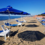 Pe plajă se pot închiria șezlonguri care vin în set de 2 cu măsuță, scaun și umbrelă. Preț: 5 – 6 euro pe zi. Pentru că eram cu bebeluș, am primit de multe ori o umbrelă mică în plus ceea ce a fost o surpriză plăcută. Apa a fost caldă și relativ curată, mai ales în prima parte a zilei. În anumite seri, însă, a devenit tulbure și cam murdară.